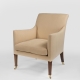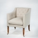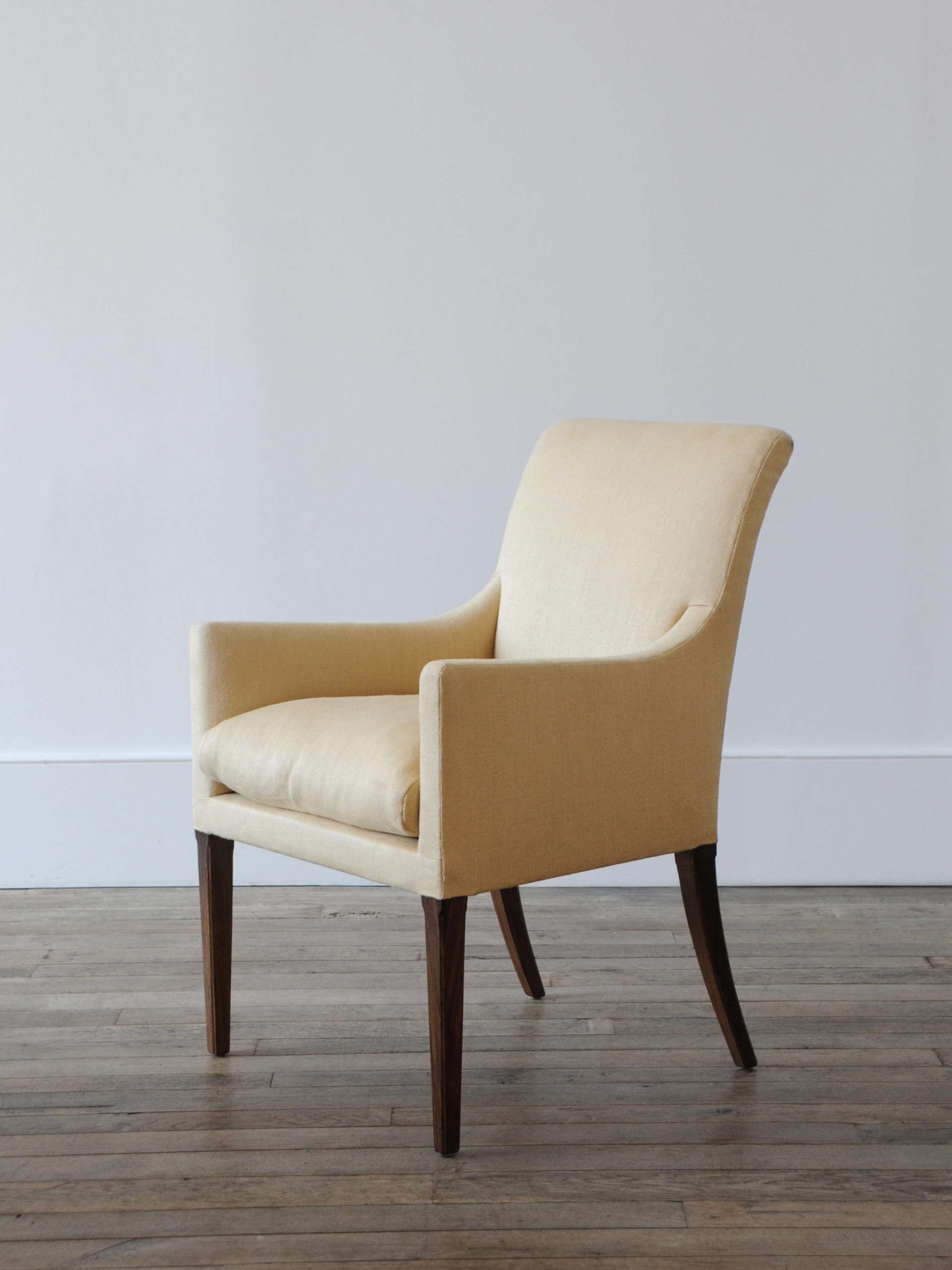 This Regency-inspired dining chair, with its classic low swept arms and elevated rake, is a fusion of three of Rose’s favourite chairs. The chair has a traditional beechwood frame with solid walnut legs. Both the front and back sabre legs have bevelled corners and are finished with a richly coloured wax. The arms have been cut low for relaxed dining and the squab seat cushion comprises of a comfortable feather and down fill. This chair is traditionally upholstered in the UK.