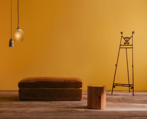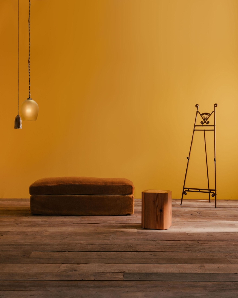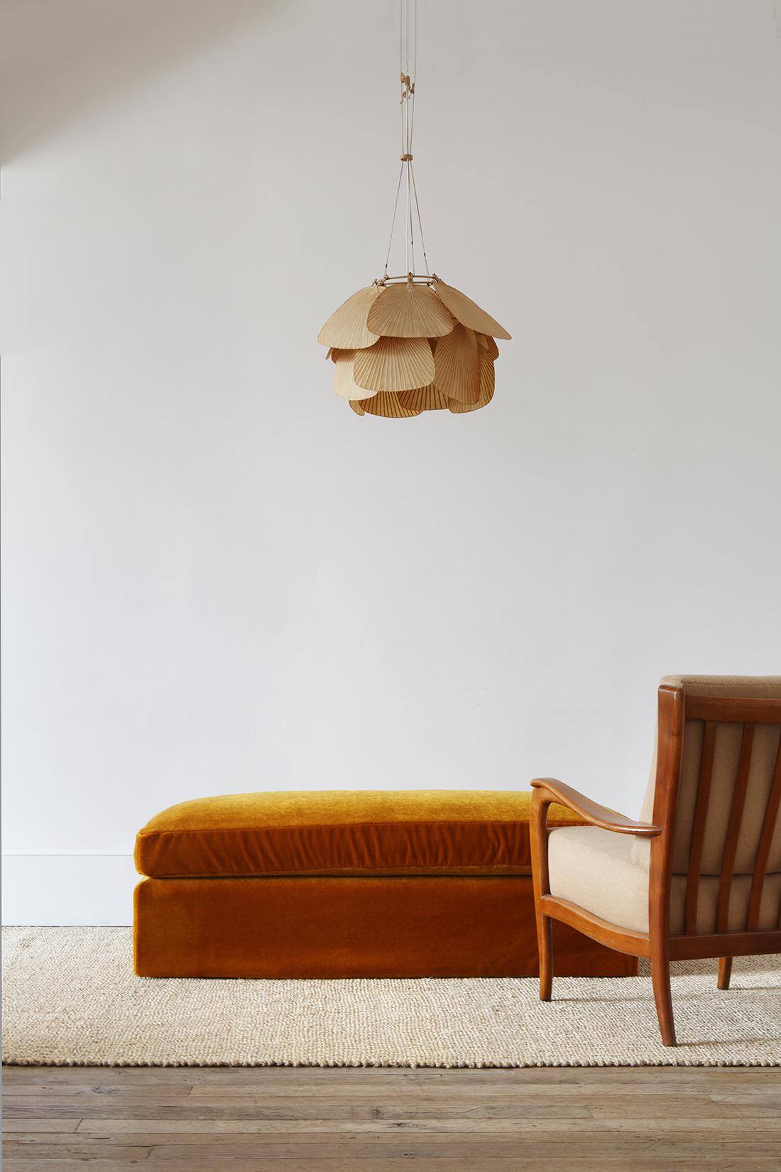 Solid stained beech base. Designed as a luxurious companion to the Corner Sofa. See here in Rose Uniacke Mohair Velvet in Caramel.